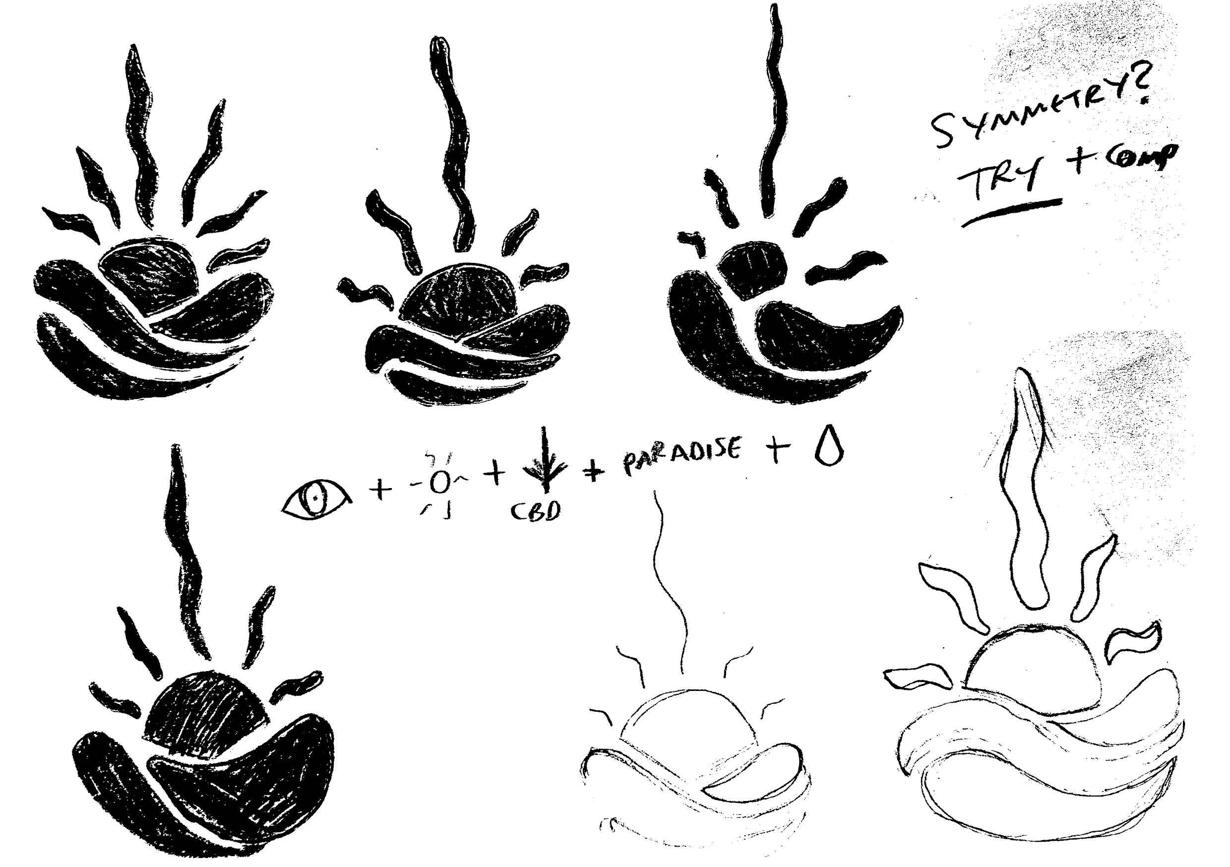 I quickly sketched various logo designs/visual cues, focusing on a few core visuals and ideas gained from my word brainstorming (notes 4). Through these sketches I came to the visuals of a water droplet, CBD plant, sun, sun rays, eye and path/mountain range and worked out a way to combine them. Despite the sun potentially making the consumer consider other company sectors such as holiday companies, Sun glasses, Heat appliances etc and not relating to a drinks brand I felt that this could work if used with the right colour palette.