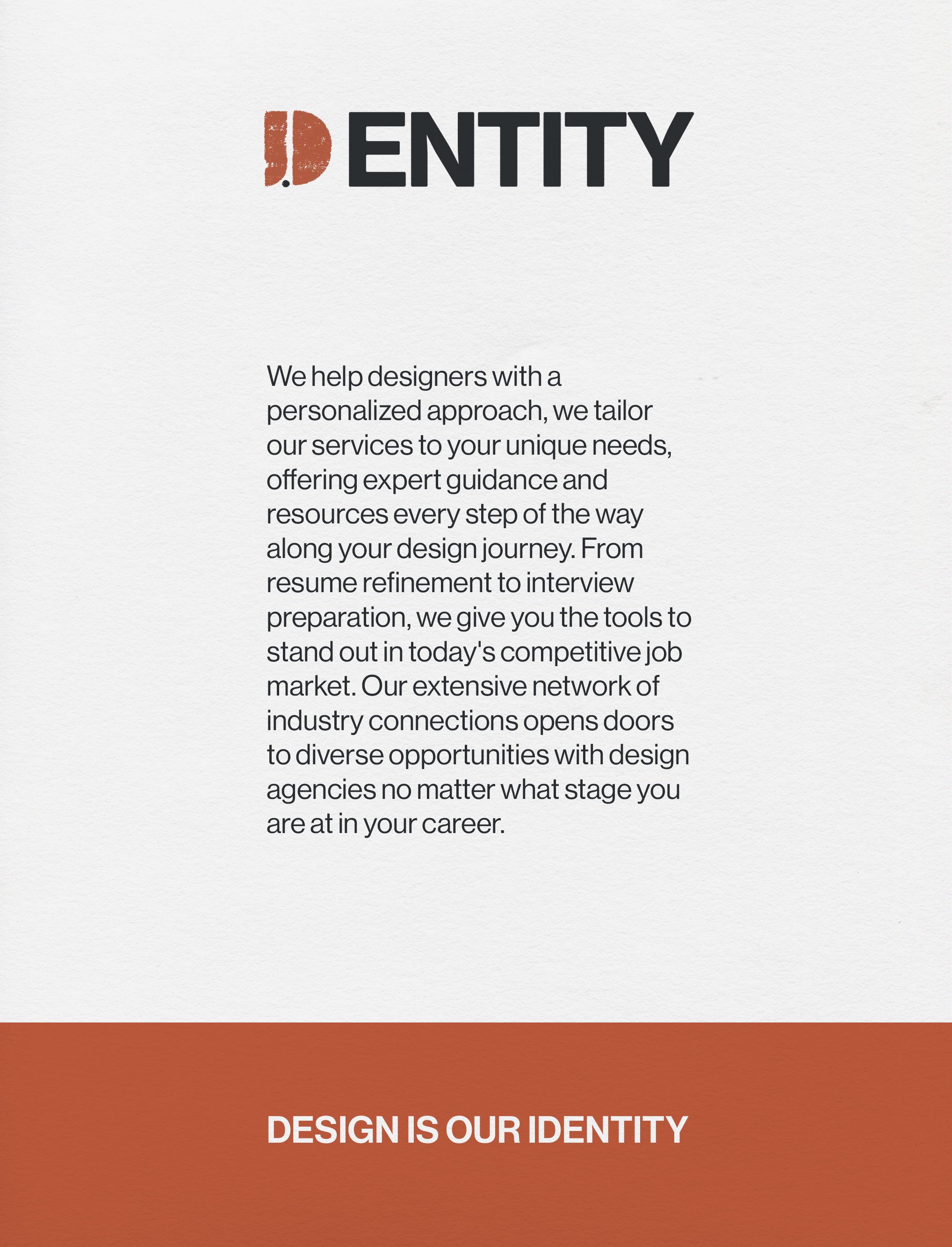 The final logo I wanted to represent a life/job pathway, which ‘Dentity’ would help the student navigate. I also aimed for the logo to stand out and wanted it to look and represent individuality. The ‘D’ and upside down ‘I’ open to create a pathway and the dot of the ‘I’ represents the person going on the journey. I printed the logo multiple times and layered them, creating a vector in Illustrator.